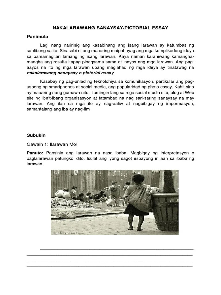 Larawang Sanaysay Katuturan / Sanaysay Tungkol Sa Edukasyon 14 Halimbawa Ng Sanaysay 2021 / Nov 12, 2013 · larawang pampahayagan.. Ang larawang sanaysay (pictorial essay) ay isang uri o aspeto ng sanaysay na kung saan ay gumagamit ng larawang binuo at ginamitan ng isang teksto o caption upang maisa larawan at maipaliwanag ang isang usapin.mahalaga ang naidudulot ng isang larawan sa pag buo ng isang sanaysay sapagkat may mga taong mas nauunawaan ang isang sanaysay kung may larawang nag … Isulat ang buong pangalan ng mga tao sa larawan kung kailangang ipakilala. Nov 12, 2013 · larawang pampahayagan. Kung ito'y isang sanaysay, maghahanda siyang isang balangkas ,susundi nito , at isusulat batay sa na tipong material. Ang sanaysay ay ang pagsasalaysay ng isang sanay o nakasulat na karanasanng isang sanay sa pagsasalaysay.