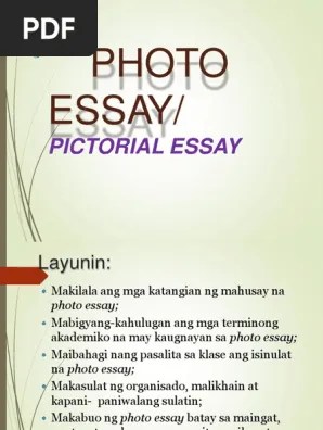 Nov 12, 2013 · larawang pampahayagan. Ano ang photo essay o sanaysay ng larawan? Ang sanaysay ay ang pagsasalaysay ng isang sanay o nakasulat na karanasanng isang sanay sa pagsasalaysay. Isa sa mga halimbawa nito ay ang larawang sanaysay. Sinasagot ang mga mahahalangang tanong. Halimbawa ay may isang susulat tungkol sa reunion ng mga dating magkakaeskuwela. Jul 07, 2016 · photo essay/sanaysay ng larawan. Ang larawang sanaysay (pictorial essay) ay isang uri o aspeto ng sanaysay na kung saan ay gumagamit ng larawang binuo at ginamitan ng isang teksto o caption upang maisa larawan at maipaliwanag ang isang usapin.mahalaga ang naidudulot ng isang larawan sa pag buo ng isang sanaysay sapagkat may mga taong mas nauunawaan ang isang sanaysay kung may larawang nag … Tama na away,sagutin na lng po ang tanong. Kung ito'y isang sanaysay, maghahanda siyang isang balangkas ,susundi nito , at isusulat batay sa na tipong material. Dapat maikli ang kapsyon na nagtataglay ng 15 salita sa isang pangungusap. Isulat ang buong pangalan ng mga tao sa larawan kung kailangang ipakilala.